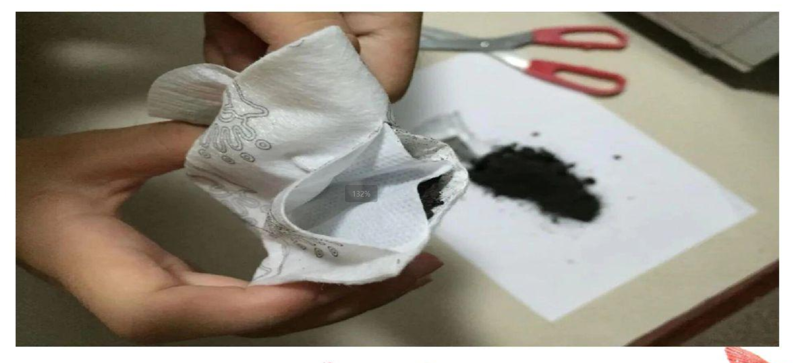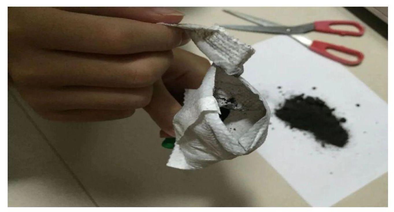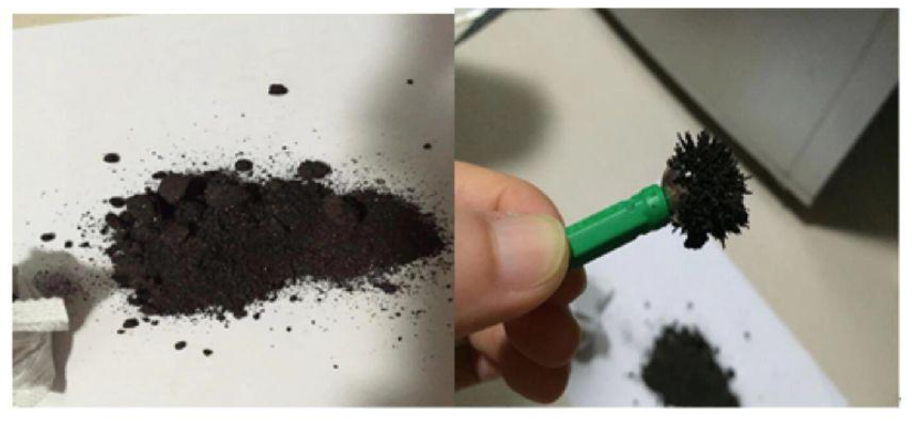 最后我剪开包装,倒出里面的材料。发现里面的材料是黑色的,很细,推测应该是铁粉,用磁力棒靠近,发现很快就吸附了一层厚厚的黑粉。可以初步判断,应该是铁粉(如图8所示)。